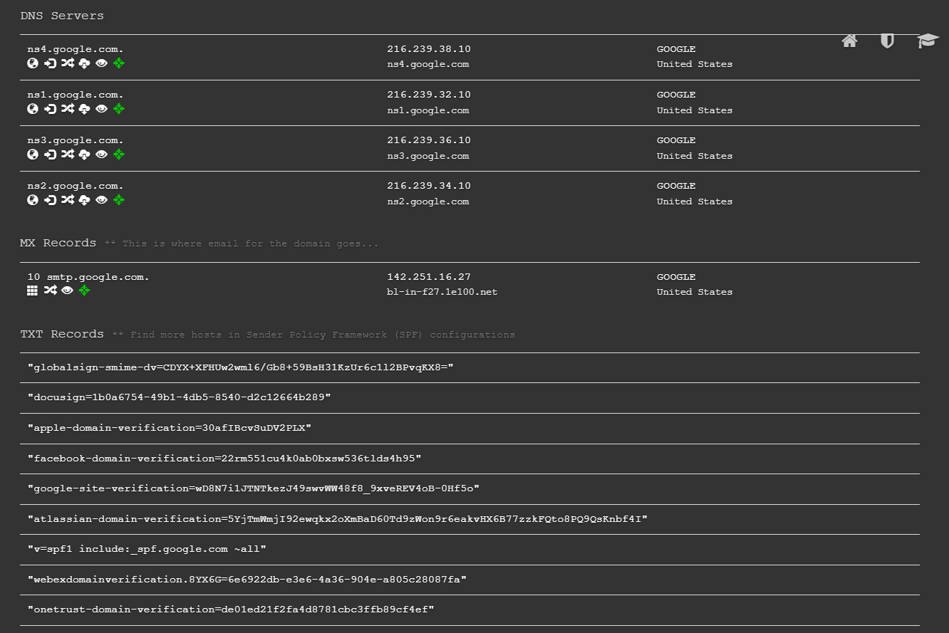 Contains various information, such as validation for Google Search Console, SSL certificates, and SPF/DMARC records for email security.
