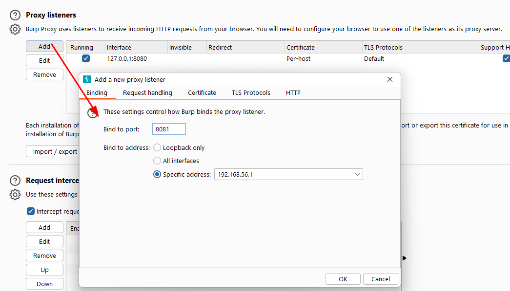 First, open Burp Suite, navigate to the Proxy tab, and go to Proxy Settings. Click Add, select the IP address used by Genymotion, and set a port number (e.g., 192.168.56.1:8081).