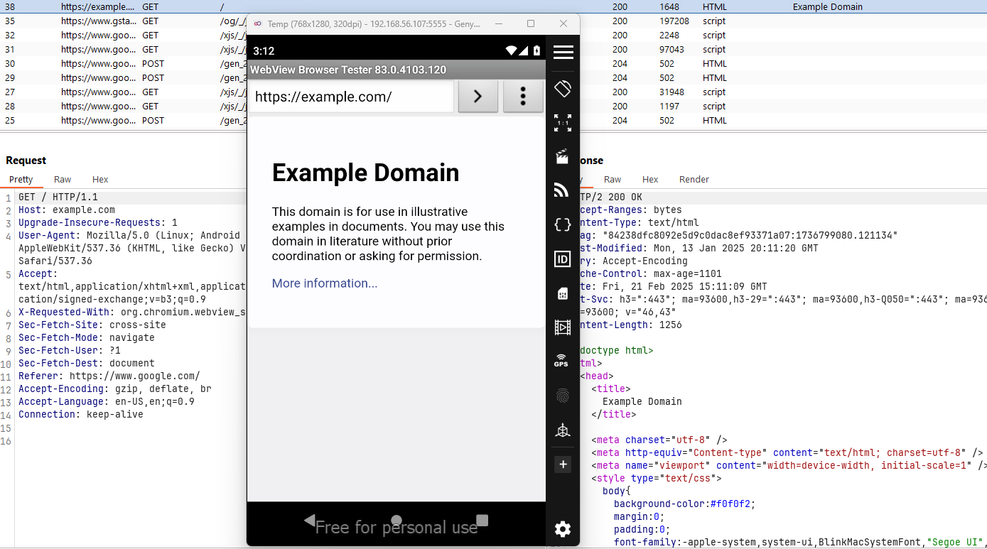 To verify the setup, open a browser on your device and visit https://example.com. If everything is configured correctly, the request should be successfully proxied through Burp Suite.
