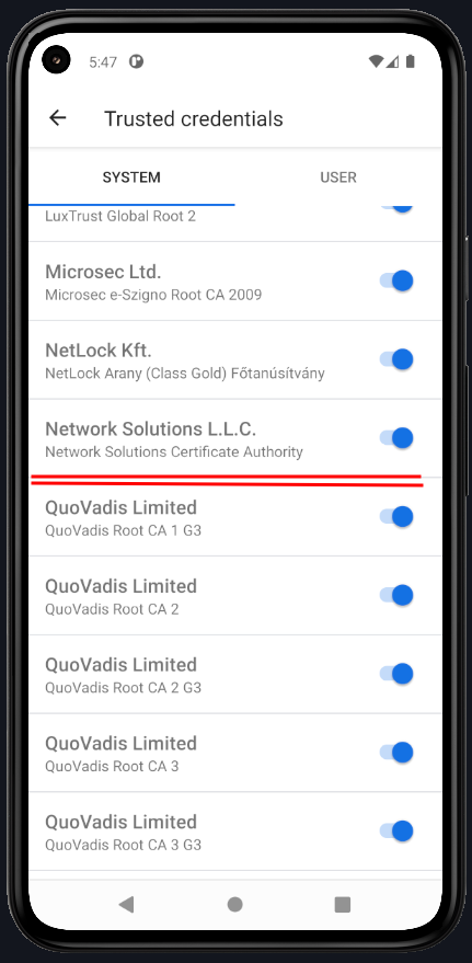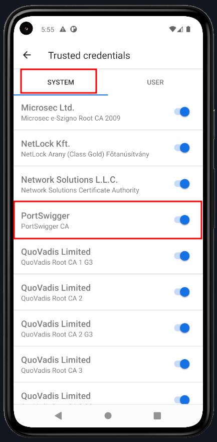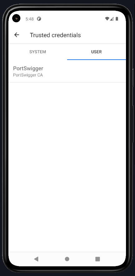 Next, go to Settings > Trusted Credentials and check that the Burp Suite certificate is now listed under System-level certificates.