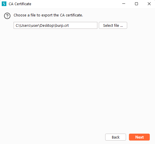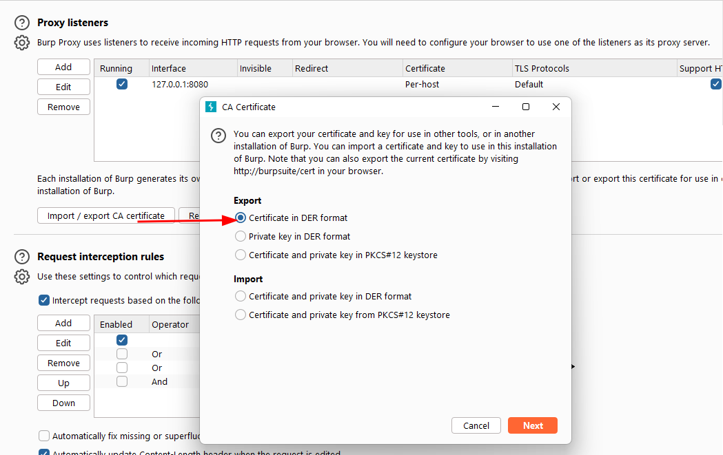 Next, obtain the Burp Suite certificate. Open Burp Suite, go to the Proxy tab, then Proxy Settings. Click Import / Export CA Certificate, export it in DER format, and save it with a .crt extension (e.g., burp.crt).