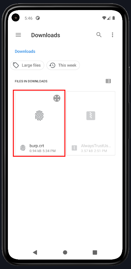 Now, drag and drop both burp.crt and AlwaysTrustUserCerts.zip onto your device.
