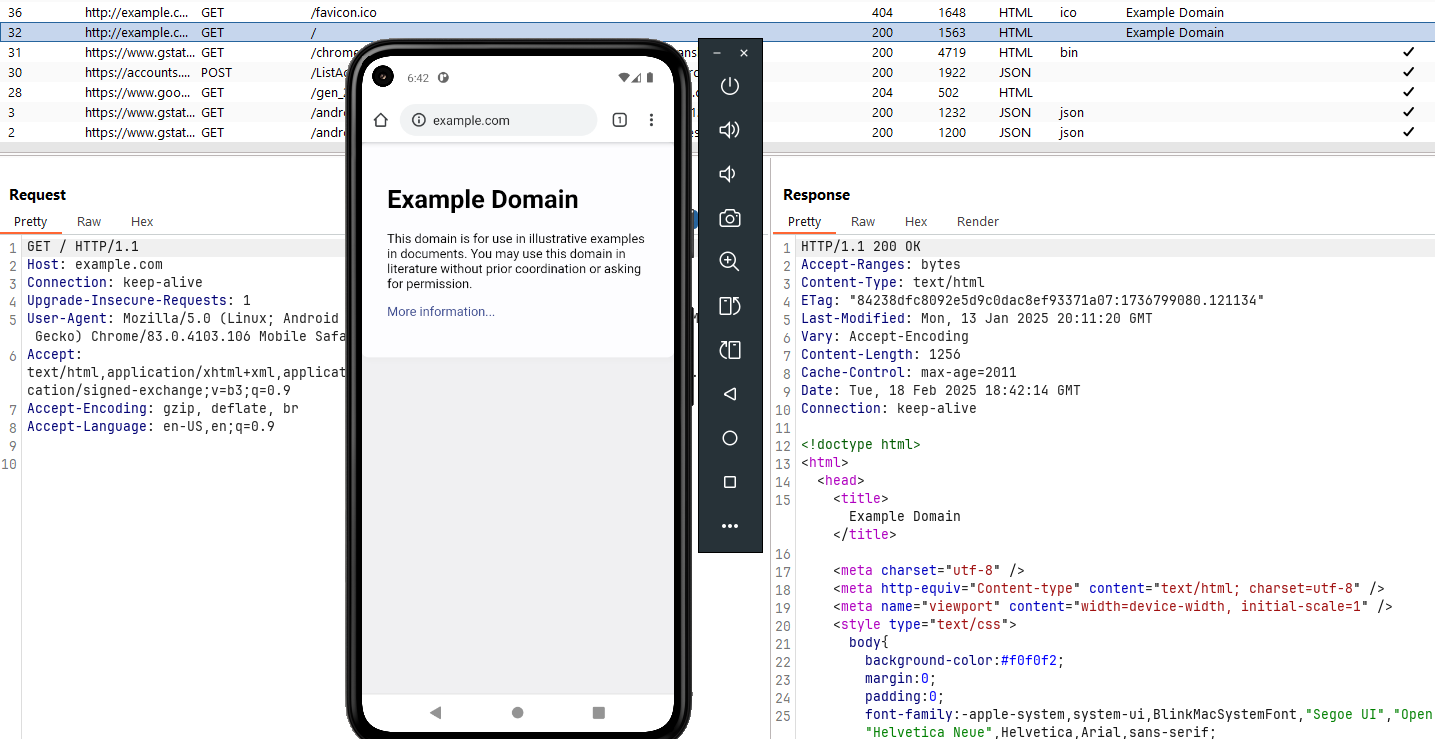 To verify the setup, open a browser on your device and visit http://example.com. If everything is configured correctly, the request will be successfully proxied through Burp Suite.