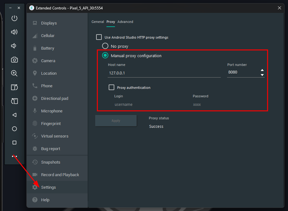 To route traffic through Burp Suite, open AVD settings and select Manual proxy configuration.