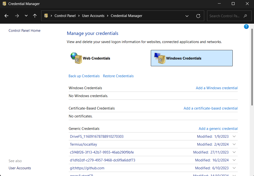 Credential Manager is a built-in Windows feature that allows users to save both Windows and Web credentials. These saved credentials are stored in each user’s Credential Locker, organized by user profile.